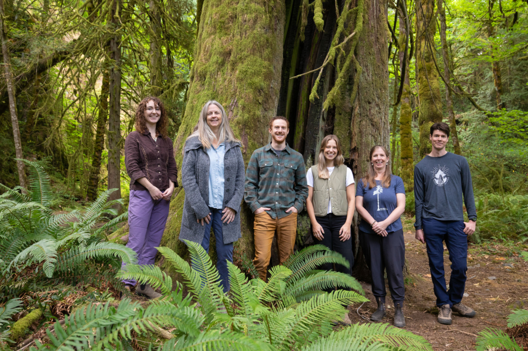 • The six AFA team members stand beside each other in front of an old-growth Douglas-fir tree.