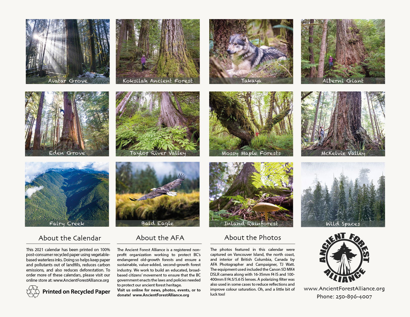 The Ancient Forest Alliance 2021 CALENDAR is hot off the press!! From the popular tourist destination Avatar Grove and old-growth “hotspot” Fairy Creek to the majestic bald eagle and more, each month showcases a spectacular image of BC’s magnificent ancient forests and the species that call them home. All photos are by AFA’s renowned photographer TJ Watt and are printed on 100% post-consumer recycled paper with vegetable-based inks.