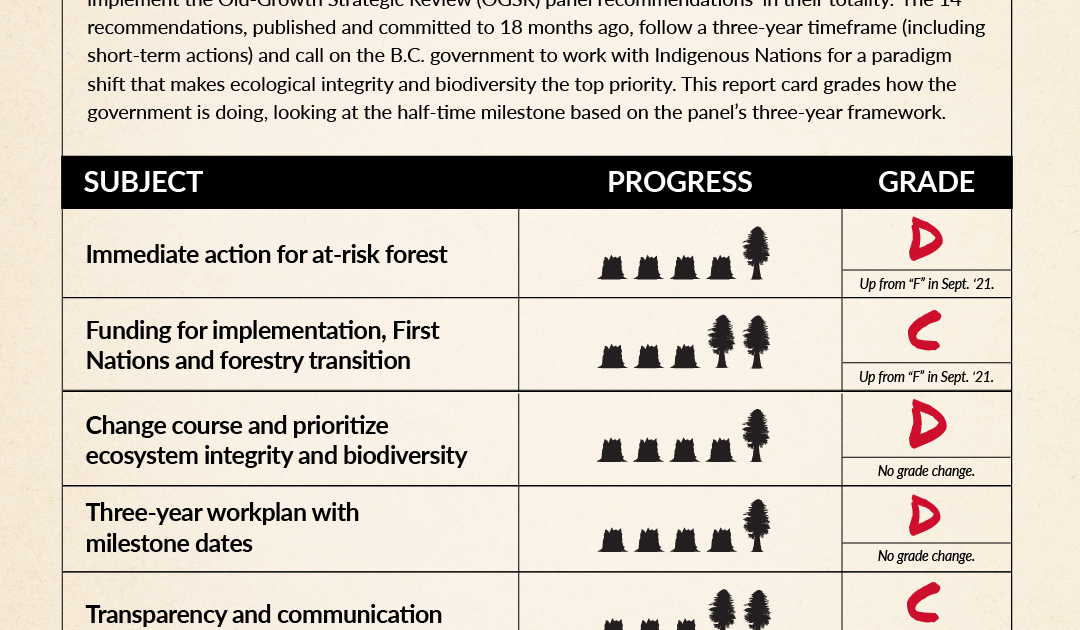The findings are part of an assessment by the Ancient Forest Alliance, Sierra Club BC, and Wilderness Committee, who today issued a report card grading the BC government’s progress on implementing the recommendations of the OGSR panel. This is the third report card issued since the panel’s recommendations were released on September 11, 2020, and falls at the halfway point of the three-year framework the panel laid out.