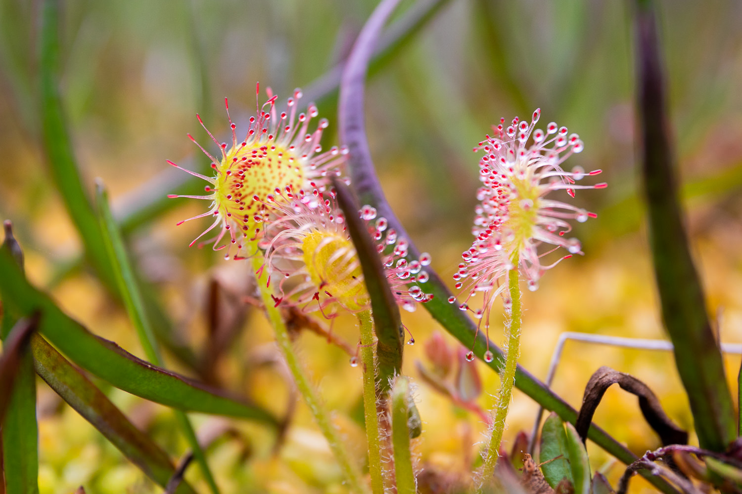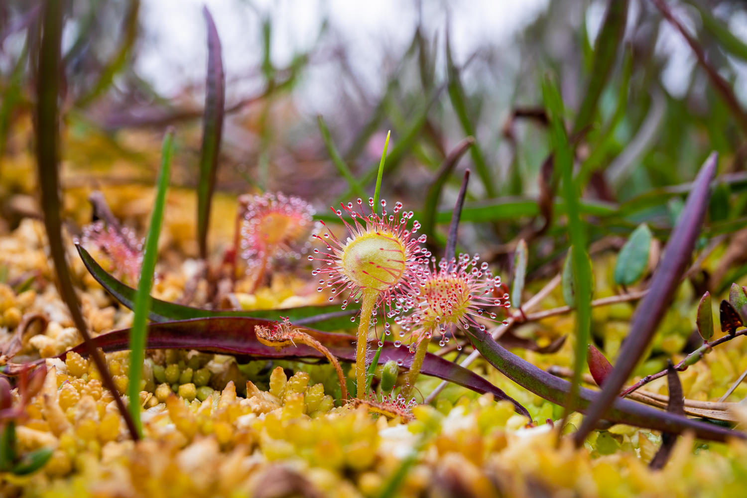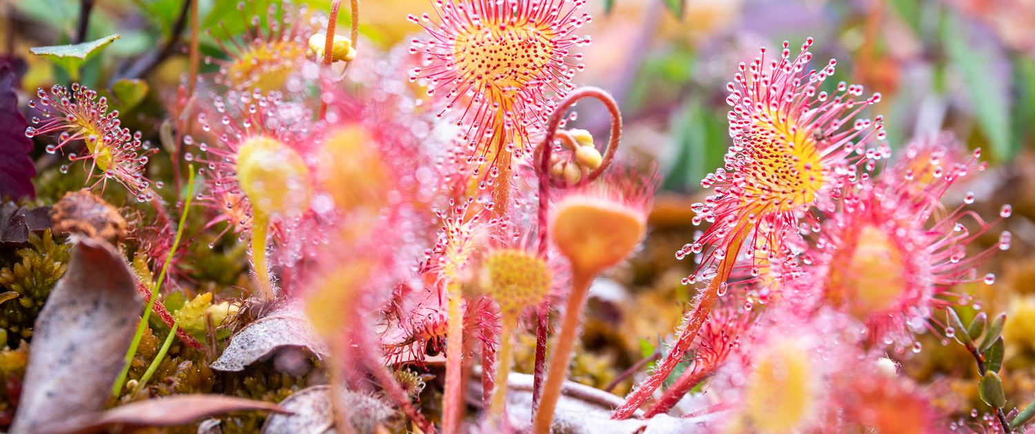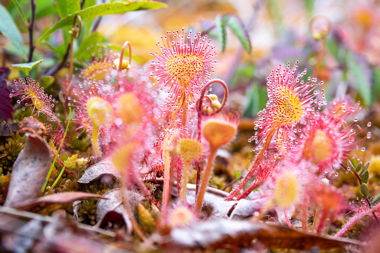 Rather than make its food through photosynthesis, carnivorous sundews, like the ones seen here, supplement their diet by feeding on insects! The tiny tentacles have a sticky dew or “mucilage” on them to help trap and digest their prey for a hearty meal.