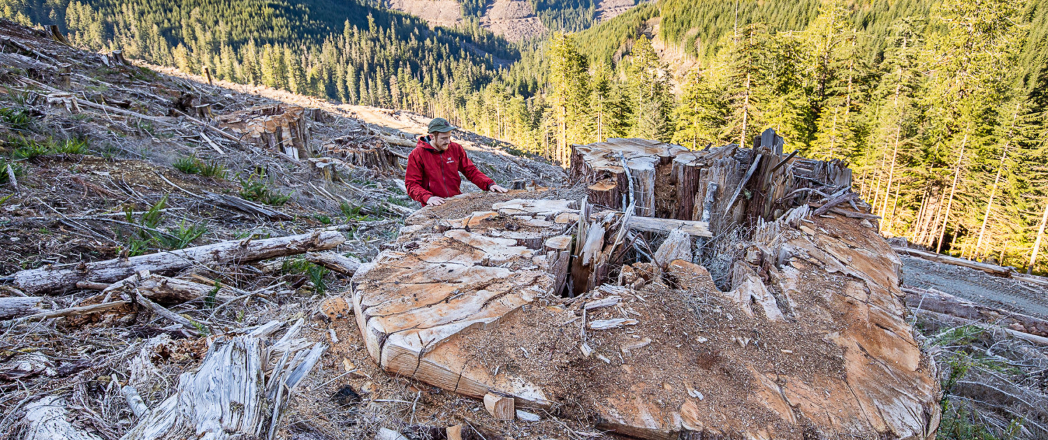 AFA Campaigner & Photographer TJ Watt surveys a sprawling old-growth clearcut totalling 33.5ha (more than 33 football fields) in size. Further old-growth logging is planned on the adjacent slopes as well.