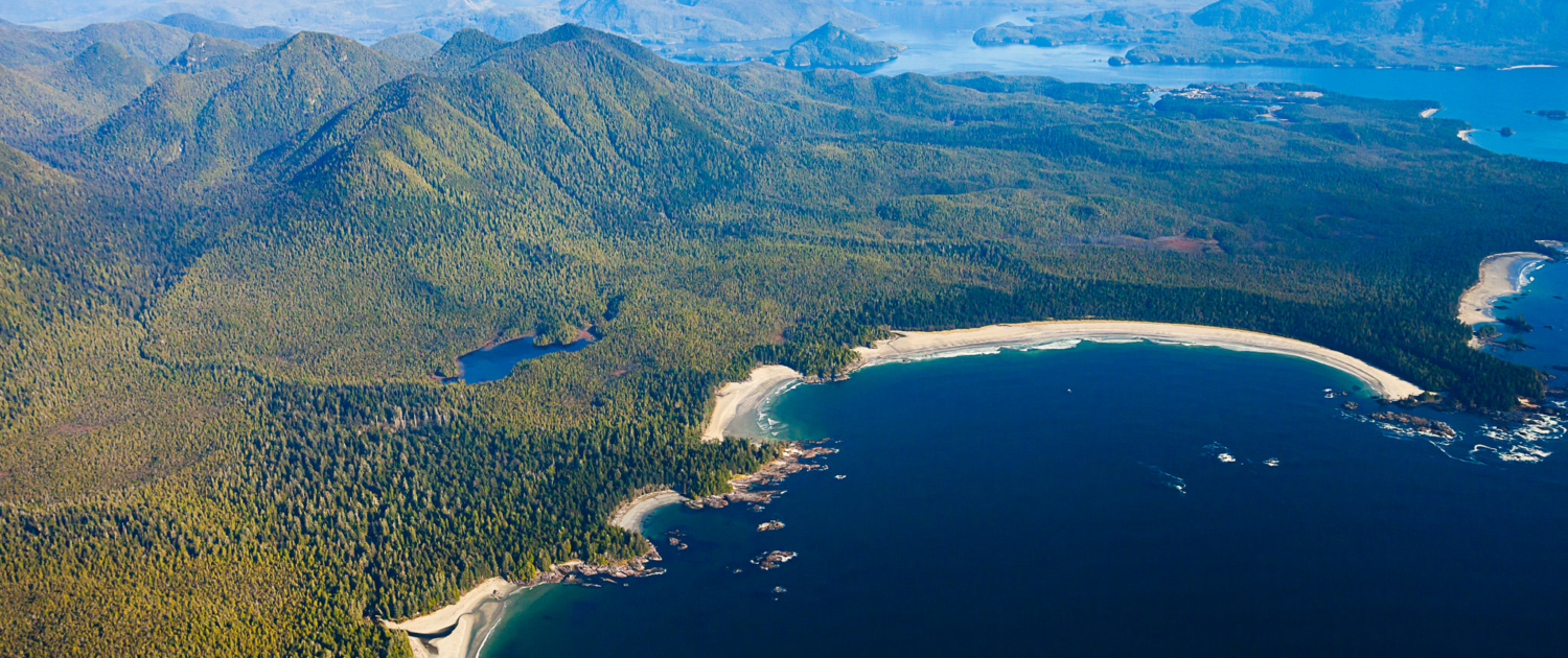 An aerial view over the ancient forests of Meares Island in Tla’o’qui’aht territory, the site of the first blockades against old-growth logging in 1984 in Clayoquot Sound.