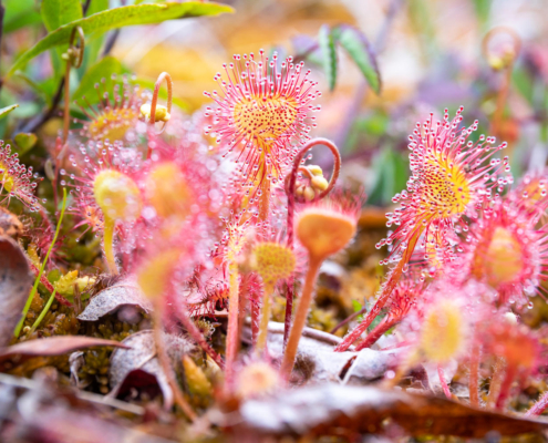 Rather than make its food through photosynthesis, carnivorous sundews, like the ones seen here, supplement their diet by feeding on insects! The tiny tentacles have a sticky dew or “mucilage” on them…