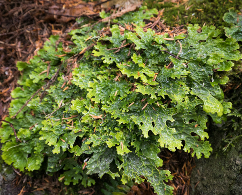 Lobaria lichens play a crucial role in forest ecology. They are able to accomplish the rare feat of fixing atmospheric nitrogen—an essential nutrient for plant growth, though almost no organisms are able to extract it from the air. These lichens mine this precious nutrient from the atmosphere and when they fall to the forest floor and decay, that nitrogen is made available to the entire ecosystem.