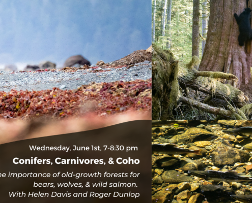 Join us on Wednesday, June 1st from 7-8:30 pm PDT for our old-growth and wildlife webinar “Confiers, Carnivores, & Coho: The importance of old-growth forests for bears and wild salmon”.