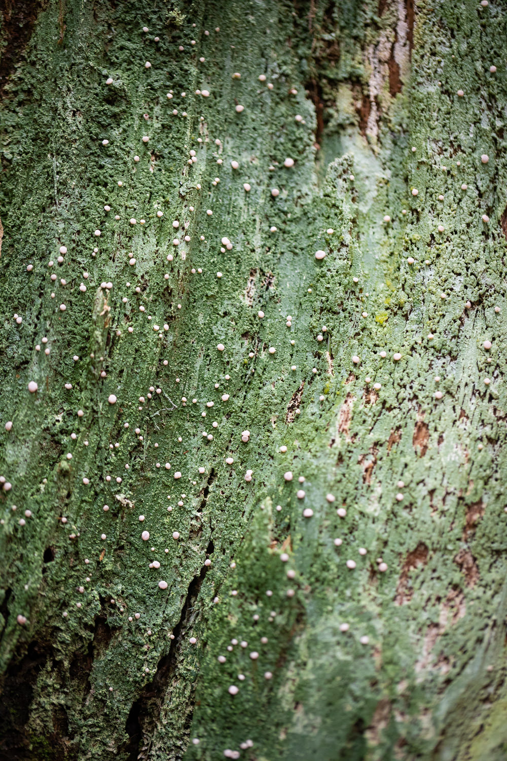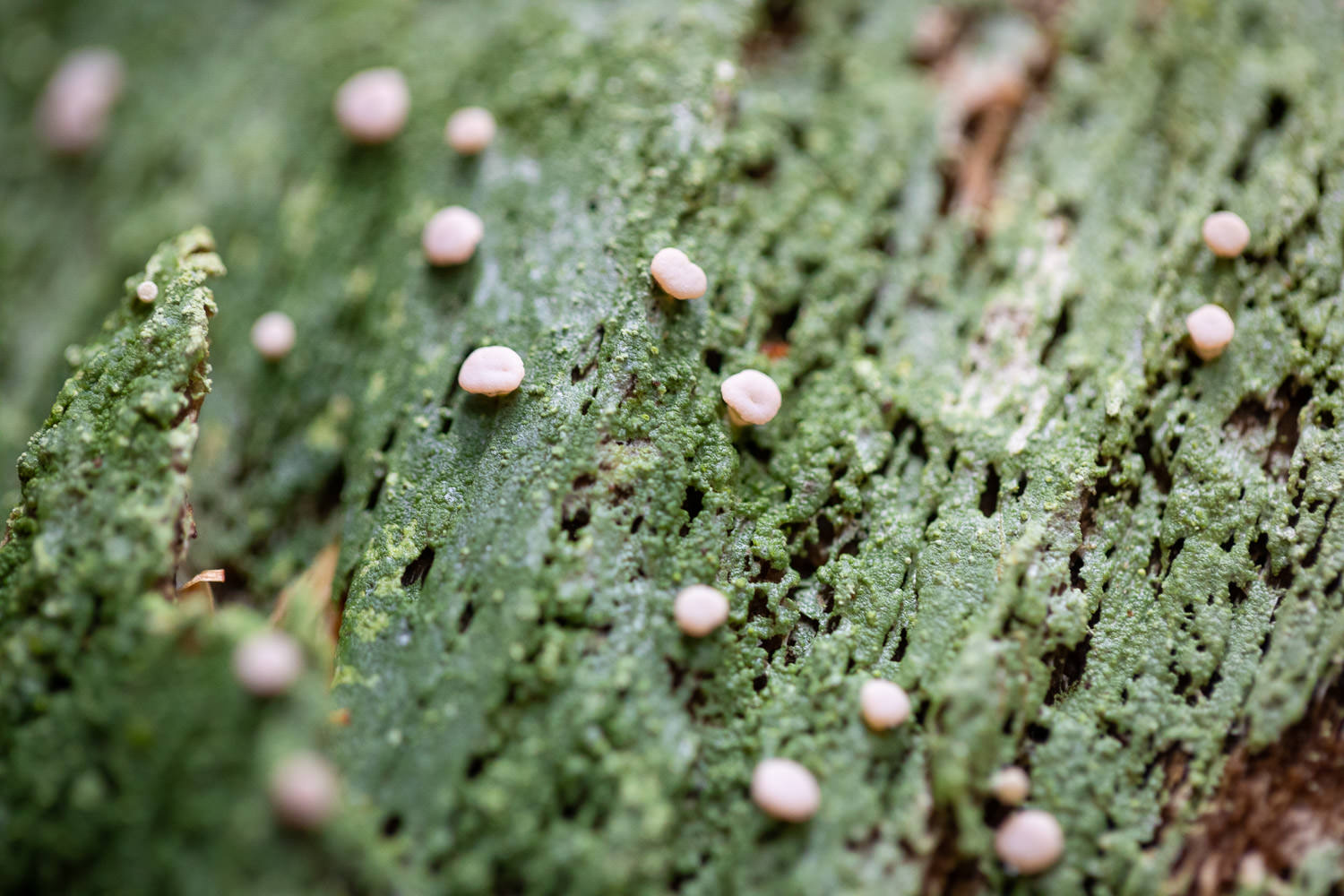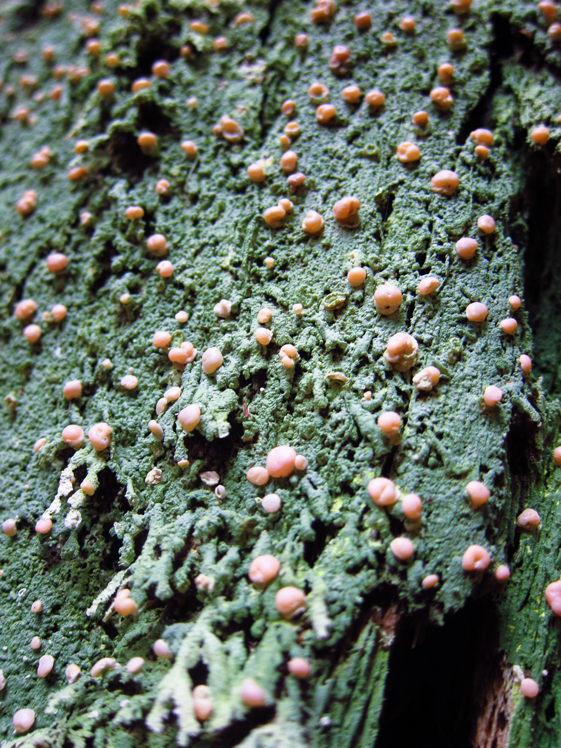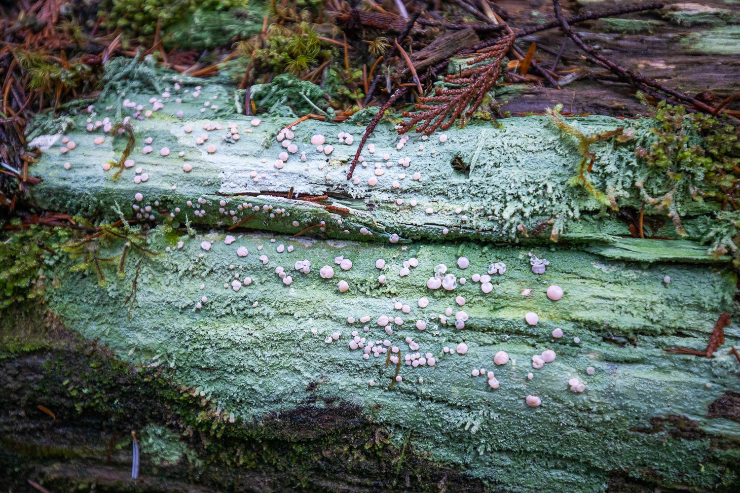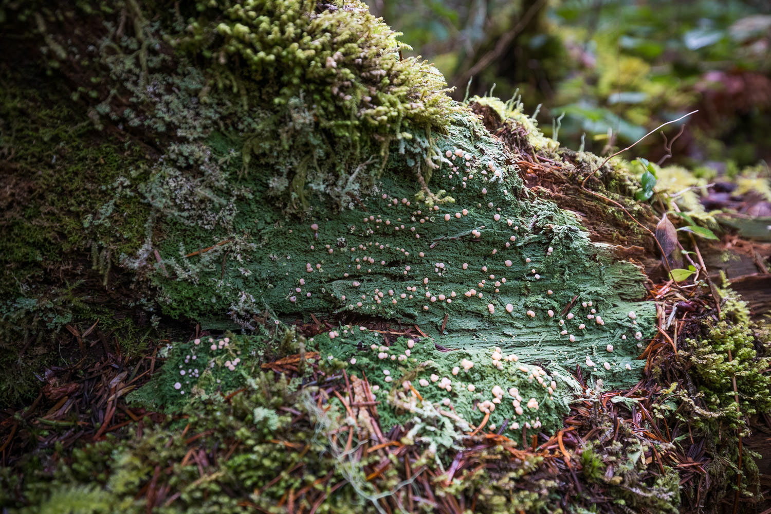 This lichen thrives on rotting logs in shaded and damp places. The green carpet is the lichen’s thallus which roughly corresponds to a plant’s leaves, whereas the pink globes (or perhaps “chunks”) are called apothecia and release reproductive spores, corresponding roughly to the fruits and flowers of a plant.