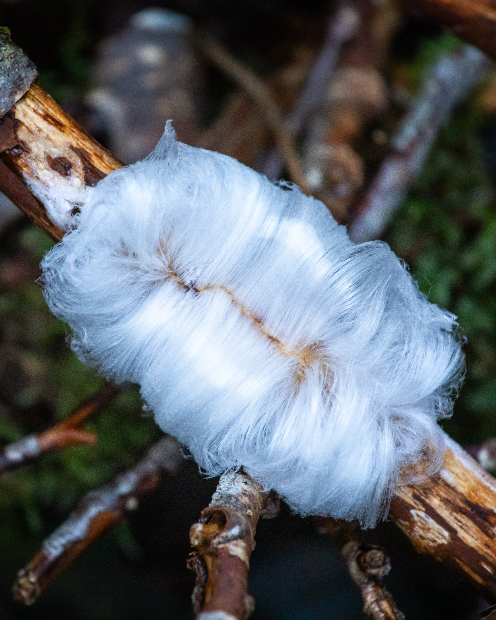Also known as “frost beard” or “ice wool”, hair ice appears only on dead deciduous wood when the temperatures are hovering just below zero degrees and when the air is humid. At first, it looks like a silvery moss or fungus, but a closer inspection shows instead a mass of fine icy filaments. These are incredibly slender, about .02 mm in diameter. Densely packed, they form a pearly cloud of ice. The slightest touch of a warm finger or even a breath will dissolve this fragile sculpture like cotton candy on the tongue.
