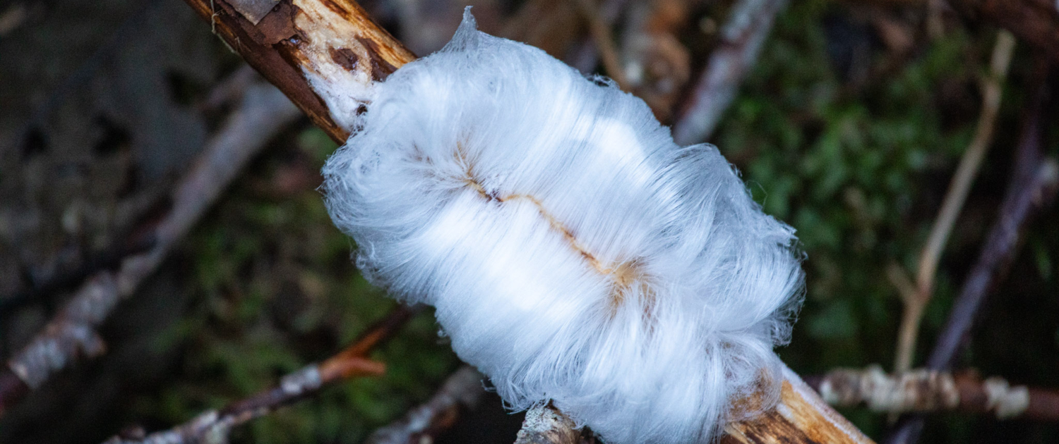 Because hair ice is associated with a specific fungus inside the wood, the same pieces may produce hair ice year after year. Around Vancouver Island, these are commonly the dead branches of red alder trees. If you are lucky enough to find it, take careful note of the exact spot, you may be able to repeat the encounter, even several years later, when the conditions are once again just right!