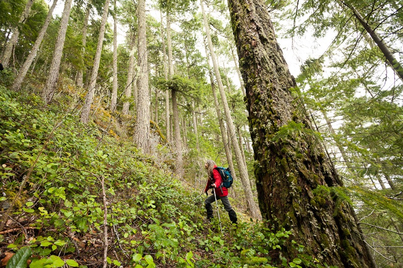 Local Port Alberni activist Jane Morden stands beside the McLaughlin Giant - an old-growth Douglas-fir measuring 23.5ft in circumference / 7.5ft in diameter. Chainsaw buzz stirs up once-protected old growth