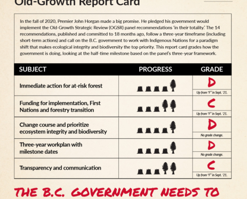 One year after the B.C. government shared its Old-Growth Strategic Review (OGSR) report and Premier John Horgan committed to implementing all of the panel’s recommendations, Ancient Forest Alliance, Sierra Club BC and Wilderness Committee have released a report card assessing the province’s progress on their promise to protect old-growth forests.