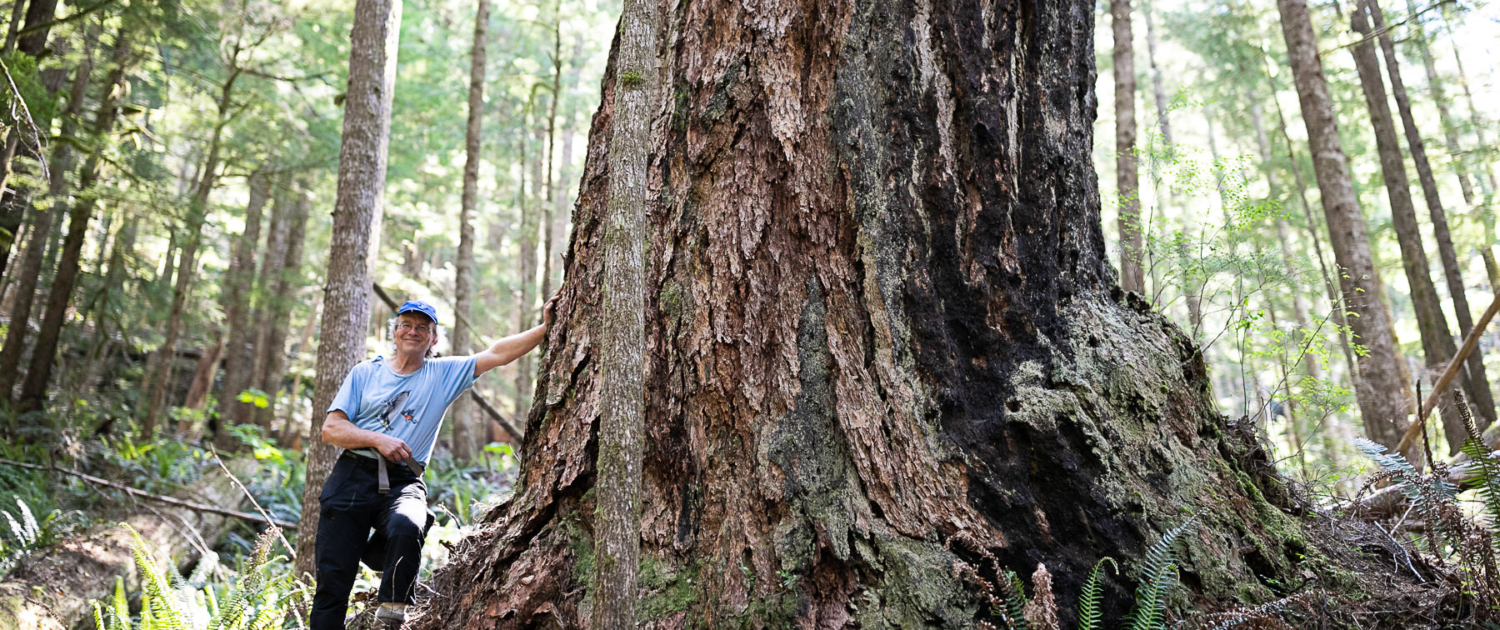 Tahsis Mayor Martin Davis next to a giant old-growth Douglas-fir tree growing unprotected near town in Mowachaht/Muchalaht territory.