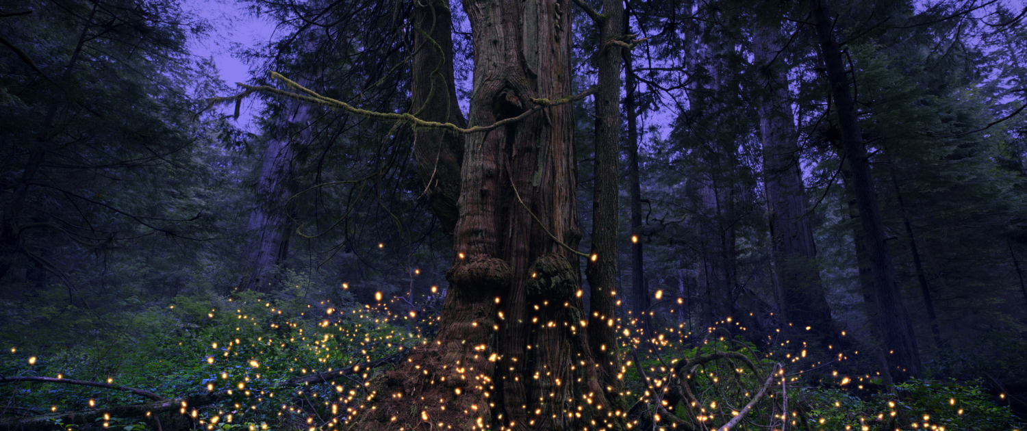 Embers and the Giants, by internationally renowned Canadian artist Kelly Richardson, a professor of Visual Arts at the University of Victoria and on the board of advisors of the Endangered Ecosystems Alliance, presents an endangered old-growth forest during last light, articulated by thousands of floating embers of light. Initial impressions may be that we are witnessing a rare, exceptionally beautiful display of fireflies. Then again, human intervention may be at play, suggesting a time when we’ll need to amplify the spectacle of nature in order to convince the public of its worth.