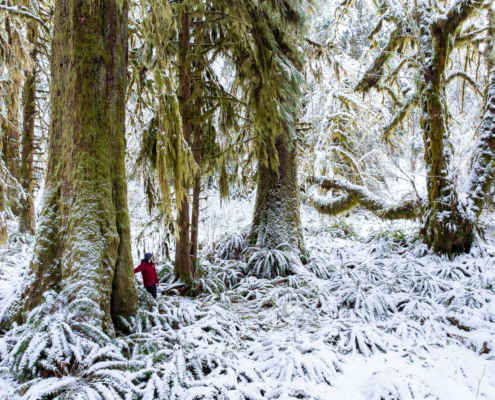See photos from the magnificent Mossome Grove and the Port Renfrew region standing hushed under a soft blanket of winter snow.