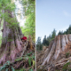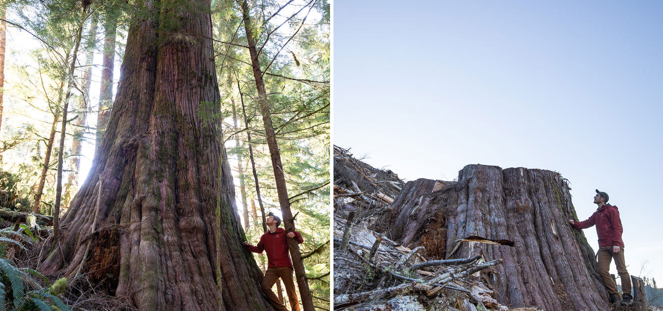 Shocking before and after images of giant ancient cedars felled in the Caycuse watershed in Ditidaht territory by Teal Jones between April and November 2020.