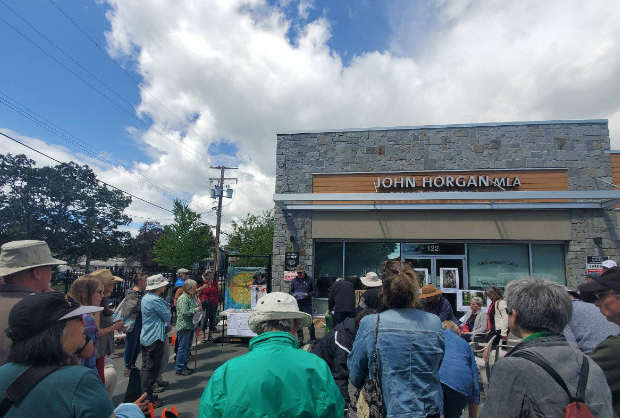 Dozens of constituents showed up outside the community office of Premier John Horgan Thursday afternoon as part of province-wide protest against the logging of old-growth on the Island.