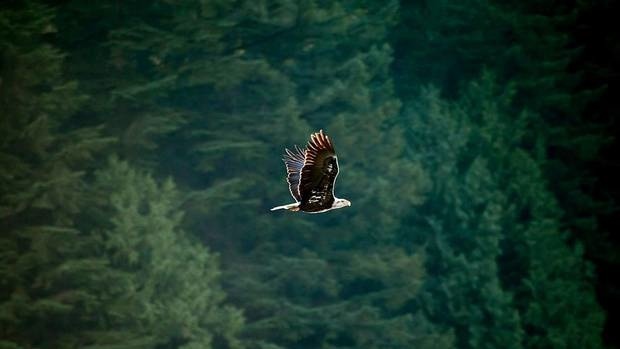 When salmon return to spawn, the eagles spend their days feasting on fish on the river banks, then, just as darkness descends, fly up to roost in the towering Douglas firs and cedars surrounding Echo Lake.