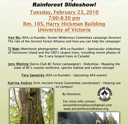 A new organization working to protect BC's old-growth forests and forestry jobs, the "Ancient Forest Alliance" (AFA), is being launched today by Victoria environmentalist and former Western Canada Wilderness Committee (WCWC) campaign director Ken Wu, former WCWC forest and marine campaigner Tara Sawatsky, and Metchosin photographer TJ Watt.