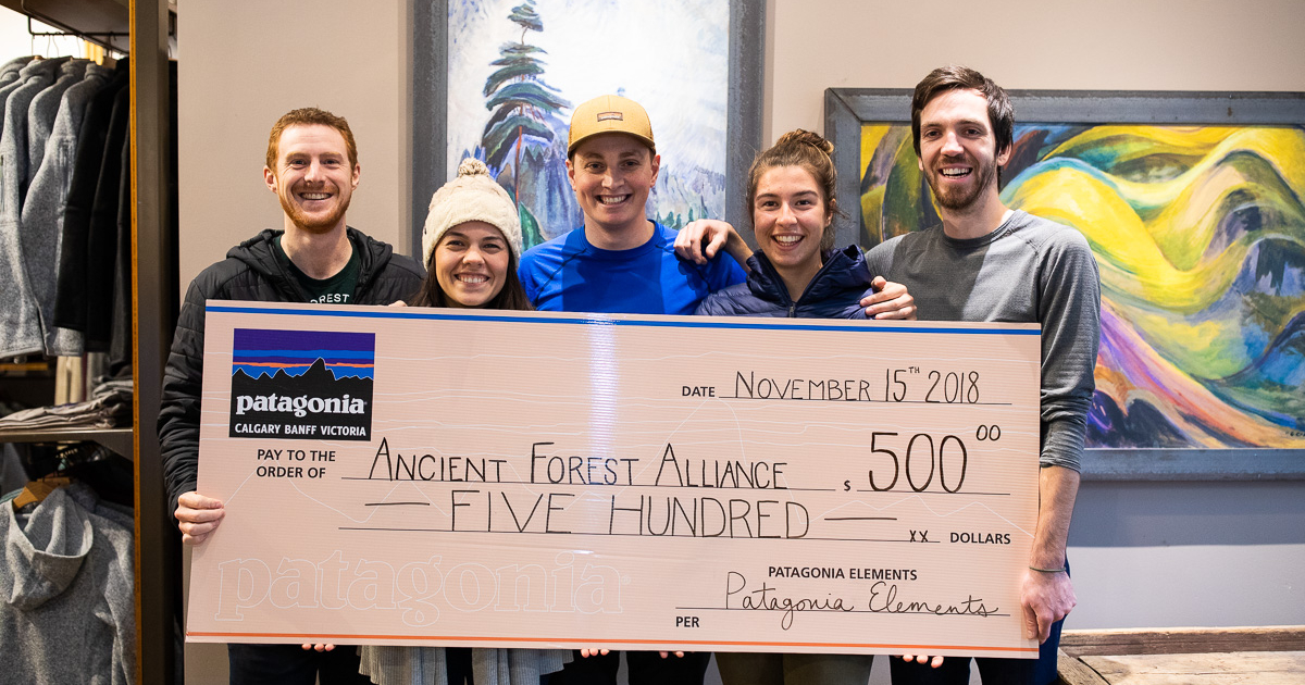 Thank you most graciously to Patagonia Victoria for generously donating $500 to the Ancient Forest Alliance! The donation comes from a recent symposium and sale at the University of Victoria which raised awareness about environmental activism, responsible consumerism, and outdoor adventures, and goes above and beyond the Patagonia Victoria/Banff /Calgary of Elements Inc. annual commitment to the 1% For the Planet program! Patagonia Victoria has also supported the movement to protect old-growth forests in BC by hosting numerous events in their store and helping to mobilize community members. We are enormously grateful for their continuous and outstanding support!