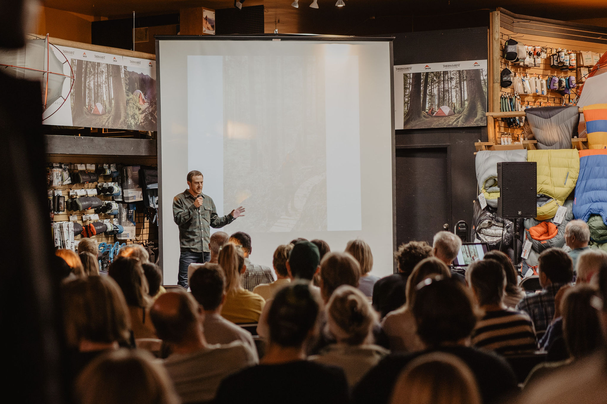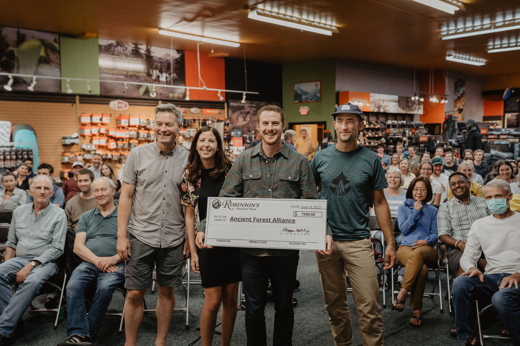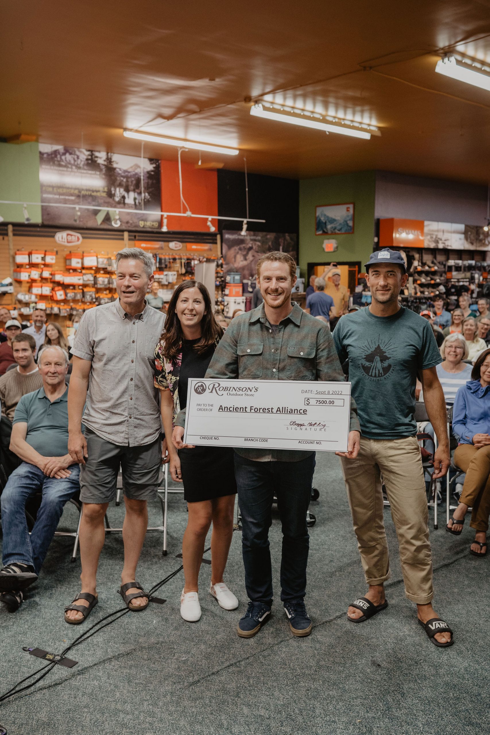 We would like to extend a massive thank you to Robinson’s Outdoor Store and Patagonia for helping raise almost $10,000 for Ancient Forest Alliance last week! More than 100 people attended the Film Night and Fundraiser for AFA at Robinson’s, where over $2000 was raised, while Patagonia donated another $7500. It was great to connect with people in person again and we are beyond grateful for the support this community shows towards our old-growth campaigns. A special thanks goes out to Erin and Matt of Robinson’s, Ross from Patagonia, Deon & Milen for the AFA films and photo stories, Strait and Narrow, Darren for his custom Ancient Forest Ale, the awesome bartenders Brendan & Erica, and everyone who came out to make this night a stellar success!