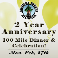 Mon., Feb.27: 100 MILE DINNER & CELEBRATION – 2 YEAR ANNIVERARY of the ANCIENT FOREST ALLIANCE!