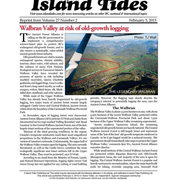 Here's a new article in the Island Tides about the Central Walbran Valley's ancient forest being flagged for potential logging – see the full article here: https://www.islandtides.com/assets/reprint/forests_20150205.pdf